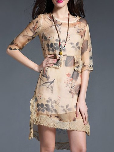 Blue Crew Neck High Low Floral Vintage Mini Dress