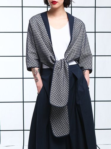 Dark Blue Checkered/Plaid Asymmetric Cotton 3/4 Sleeve Coat Discounted at only: US$ 188.00